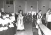 Monsignor J.J. O'Brien in a procession for a Mass along with Rev. R. Sullivan (deacon) and Rev. P. Fry (sub-deacon)