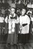 This is a photograph of Msgr. Romeo Ketchen reading before blessing with holy water, possibly at a school.