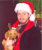 Photograph is a portrait of Rev. Michael Mireau with his dog wearing a Santa hat. Pesumably this photograph was taken around the Christmas season.